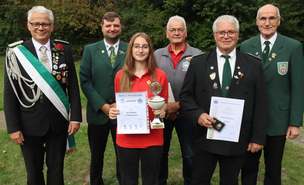 Erstmals erhielt das Nachwuchstalent, Kira Holtmann, den Erinnerungspokal im Bereich der Kurzwaffen-Sportler. Ihre Meisterschafts-Platzierungen und Siege mit der Luft- und der Sportpistole, reichen von der Kreis-, über die Bezirks-, bis hin zu Landesmeisterschaftstiteln. Bei der Deutschen Meisterschaft vertrat sie zudem als einzige Jugendliche in diesen Disziplinen die westfälischen Farben. Persönlich sehr gute Ergebnisse bedeuteten Mittelfeldplatzierungen auf der ehemaligen Olympiasportstätte vor Monatsfrist. Die Auszeichnung „Sportlerin des Jahres 2025 – Kurzwaffe“ erhielt Kira Holtmann aus den Händen des Bezirkssportleiters Konrad Adamitz (Hille) und Bezirksjugendleiter Jochen Dräger (Herzebrock).